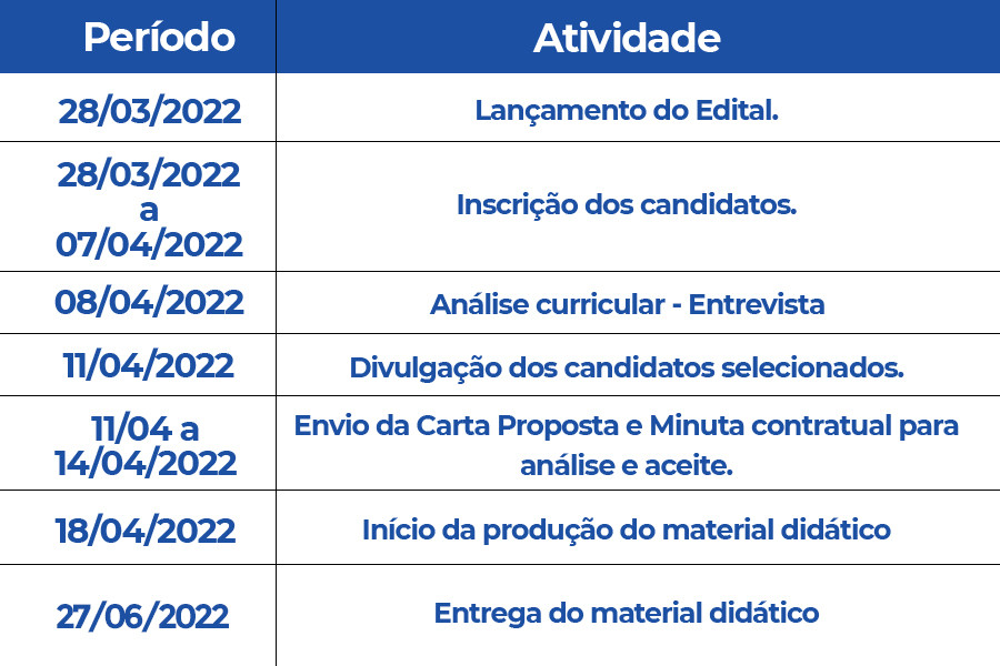 O processo seletivo deverá obedecer ao cronograma abaixo indicado:
