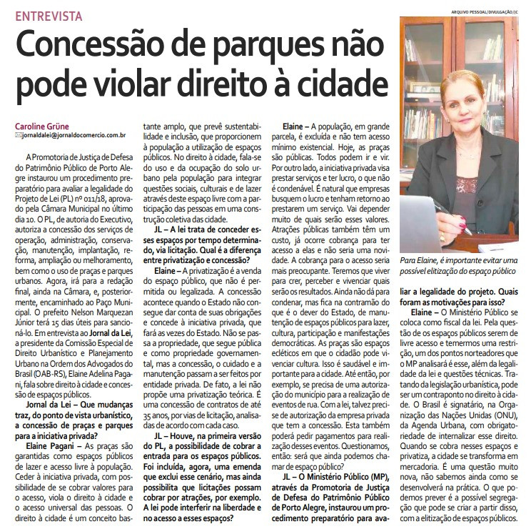 Neste contexto a Coordenadora do curso de Direto da Faculdade CNEC Gravataí, professora Elaine Pagani, concedeu uma entrevista ao Jornal do Comércio do dia 15 de abril. Além da entrevista a Coordenadora ministrou uma palestra com o debate: “O Futuro de Parques e Praças de Porto Alegre” no Instituto dos Arquitetos do Brasil.